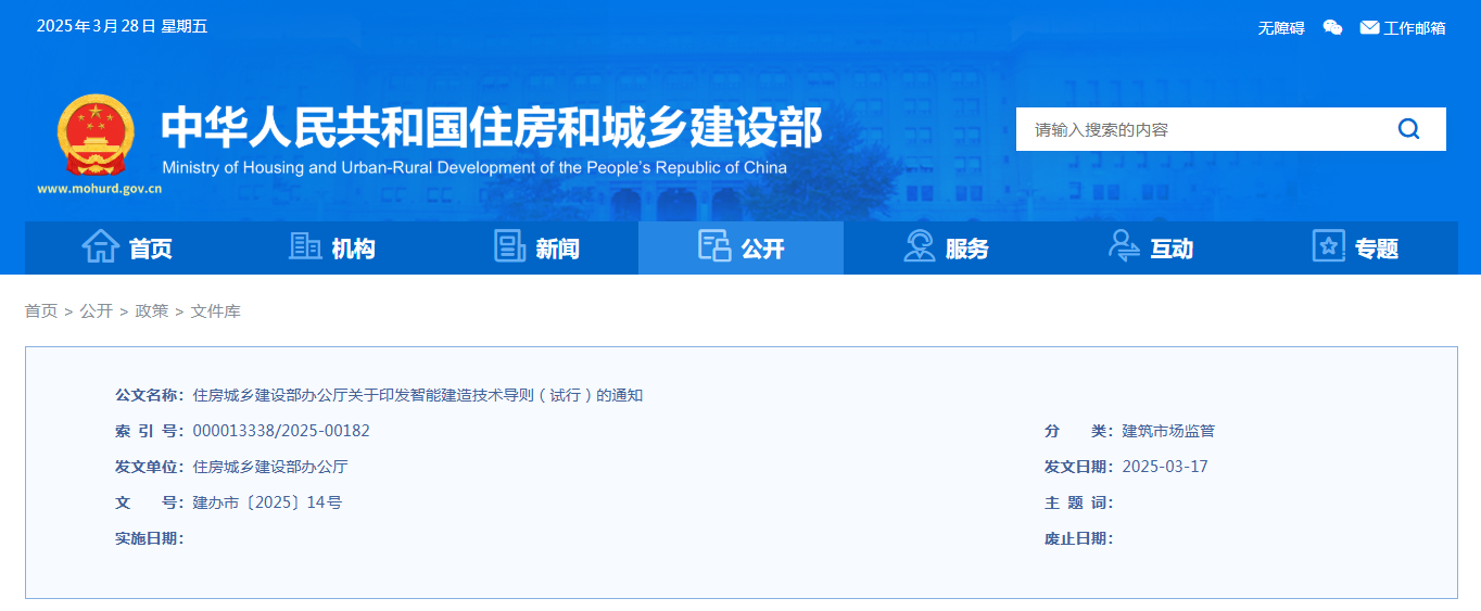 為貫徹落實《中共中央辦公廳、國務院辦公廳關于推進新型城市基礎設施建設打造韌性城市的意見》等文件要求,加快推進智能建造技術在工程建設全生命期應用,推動建筑業(yè)高質(zhì)量發(fā)展,住房城鄉(xiāng)建設部組織編制了《智能建造技術導則(試行)》?,F(xiàn)印發(fā)給你們,請結(jié)合實際參照執(zhí)行。
